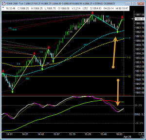 Often after a day of big moves there is a short 3-5 point move just before the close.  OUr system signals catch these moves right as the market retraces.  See this 2000 tick chart for the signal.  The market had been all over the place today with a high of 1872 and a low of 1844.  From 1:30 PM the market had regained all of its previous losses and reached 1867.